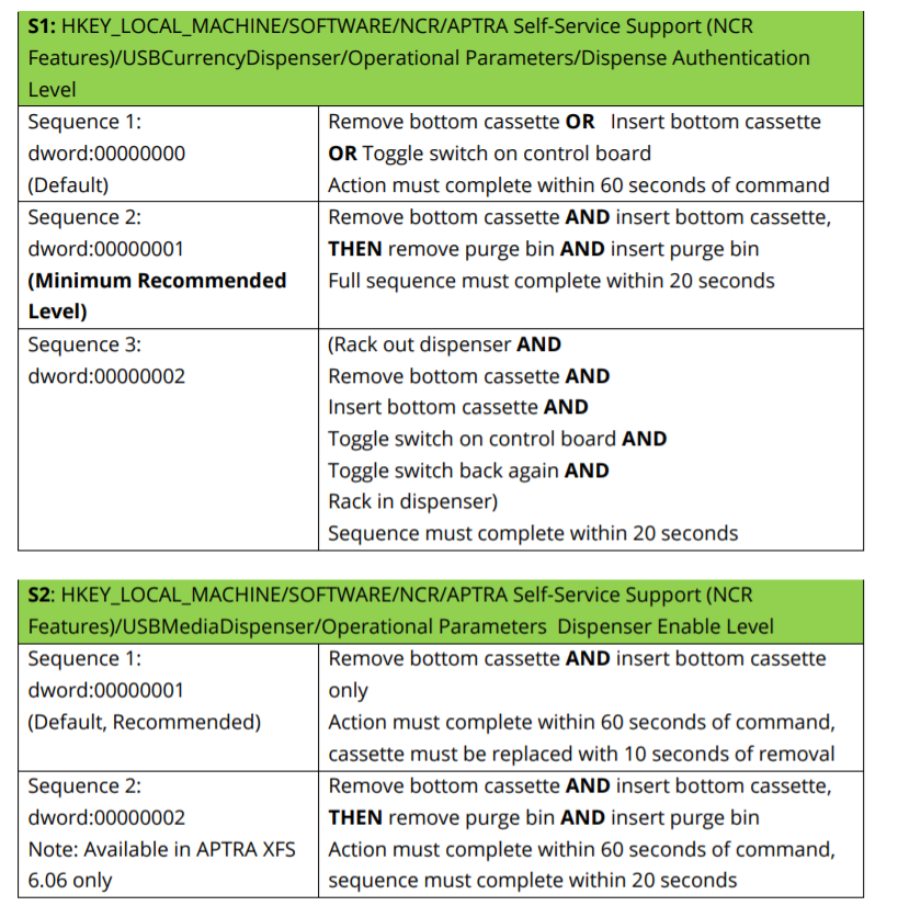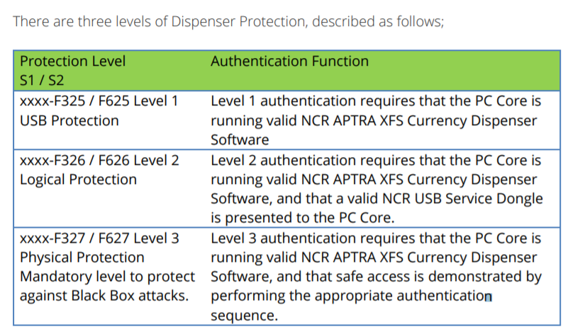Cada una de estas configuraciones agrega una medida nueva o proceso nuevo para dificultar que el atacante pueda intervenir el ATM y dispensar Dinero, por ejemplo el level 3 que actualmente es uno de los más usados requiere no solo de software correcto para dicho modelo de dispensador sino además efectuar un proceso físico de extracción de gavetas y de dispensador durante cierto proceso y ciertos segundos que permite que ese proceso sea muy difícil de efectuar o casi imposible con la puerta de la bóveda cerrada .