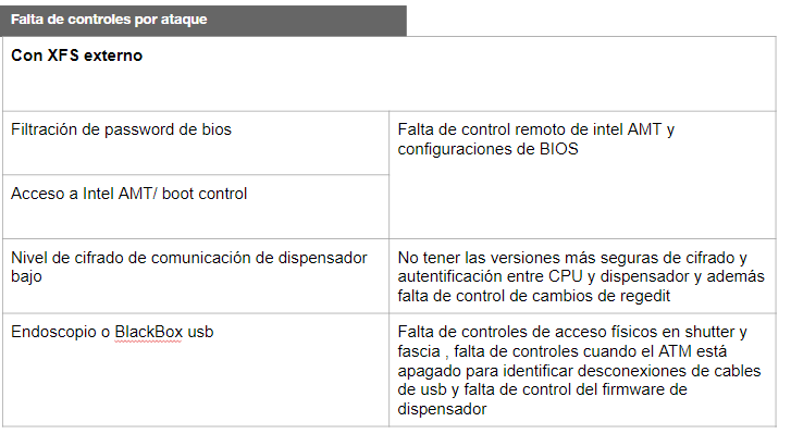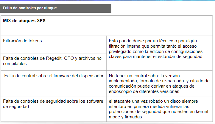 A un mix de Ataques XFS lo llamamos a los controles que faltan implementar para complementar las capas de seguridad para asegurarnos que las funciones o poco controles que se tienen actualmente no puedan ser vulnerados, como hemos explicado anteriormente ningún control por software es infalible más tarde o temprano puede caer sea por alguna filtración interna o por colusión entre un empleado de servicios y un externo.